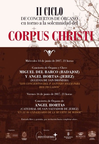 Hoy miércoles día 14 de junio a las nueve de la noche, en la Iglesia de San Dionisio, comenzará el II Ciclo de Conciertos en torno al Copus, organizado por el Cabildo Catedral y patrocinado por Montesierra, con la colaboración de Bodegas Sánchez-Romate, Real Academia de San Dionisio de Ciencias, Artes y Letras y el Excelentísimo Ayuntamiento de Jerez de la Frontera.
