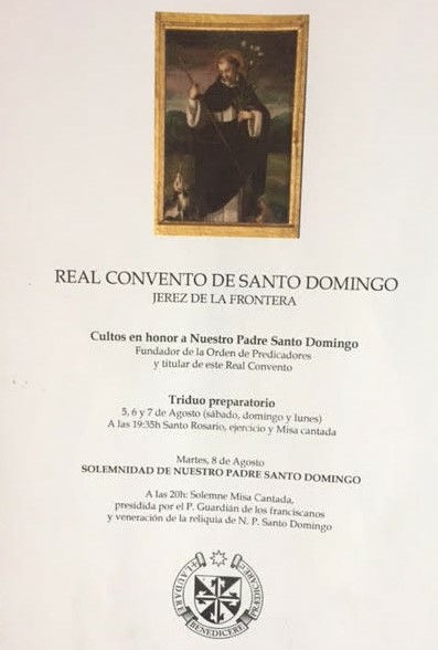 La comunidad dominica jerezana celebrará Cultos en honor al fundador de la Orden de Predicadores Santo Domingo de Guzmán que consistirán en Triduo Preparatorio durante los días 5, 6 y 7 de agosto, comenzando a las 19.35 horas con el rezo del santo Rosario, Ejercicio y Eucaristía cantada a las 20.00 horas, culminando el día 8 de agosto, martes, su Solemnidad en el marco de una Eucaristía Solemne también a las 20.00 horas, cuya predica estará a cargo, siguiendo la costumbre dominicana, por un Hermano Franciscano el Guardián del Convento de Nuestra Señora de Regla (Chipiona). A su finalización se expondrá a los fieles reliquia del Santo Dominico.